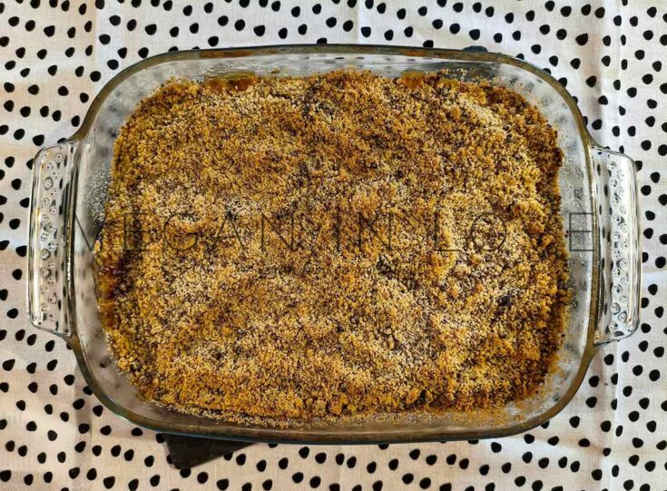 - Place the baking dish in the center of the oven and bake for around 35 minutes or until the crumble gets golden brown.