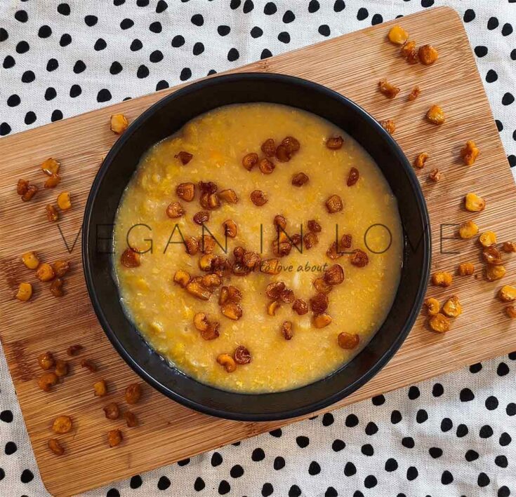 Sopa cremosa vegana de maíz, hecha con maíz dulce, patatas y especias. Esta sopa fácil y sencilla no contiene lácteos y es ideal para una comida rápida y rica.